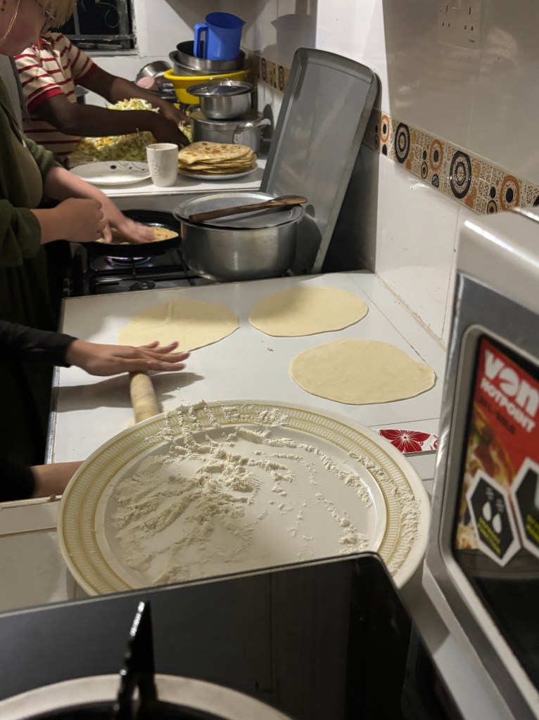 23.08.2025 – Wenn wir abends wieder nach Hause kommen, dann riecht es schon immer nach gutem Essen. Hier zum Beispiel konnten wir beim Chapati ausrollen helfen. Chapati haben einen pizzaähnlichen Teig und werden in Öl angebraten. Sie sind typisch kenianisch und werden sehr oft gemacht. Was es neben Chapati und Reis auch noch oft gibt, ist Ugali. Das ist eine Art fester Brei aus Maismehl. Die Zubereitung ist sehr kraftintensiv und man benötigt viel Willenskraft, weil sich das Umrühren als widerspenstig herausstellt.