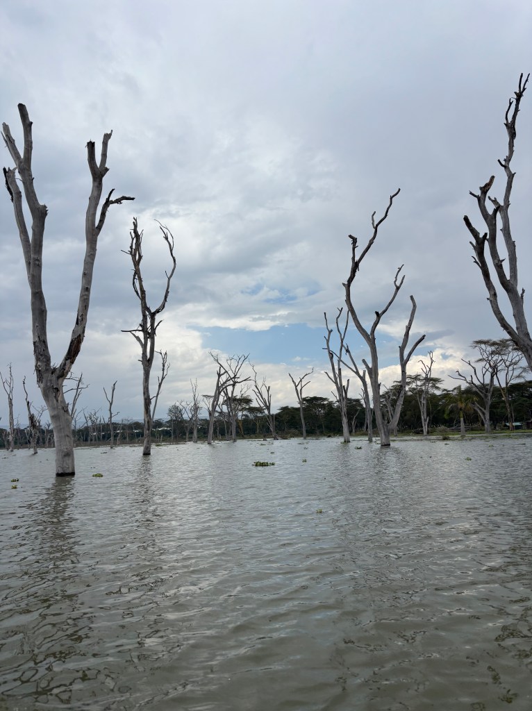 Als wir dann am See angekommen waren, sind wir dort in ein Boot gestiegen und haben eine kleine Rundfahrt gemacht, um die Natur und die Tiere zu sehen. Ganz viele Flusspferde und verschiedene Vogelarten sind uns über den Weg gekommen. Auf dem Lake Naivasha befindet sich eine kleine Insel. Diese war früher noch zu Fuß oder mit dem Auto erreichbar, doch heute kann man davon nur noch etwas erahnen, durch die ganzen Baumstümpfe, die aus dem Wasser ragen.