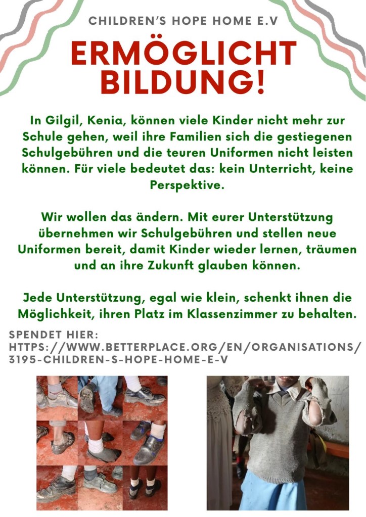 Die Kinder, die von den Spenden profitieren, haben es wirklich dringend nötig. Ich möchte deshalb gerne zum Spenden aufrufen. Auch kleine Beträge machen hier schon einen Unterschied und helfen uns weiter. Die Kinder – und auch wir – würden uns sehr darüber freuen, wenn ihr es ermöglicht, dass sie eine Zukunft haben, die gute Bildung beinhaltet.