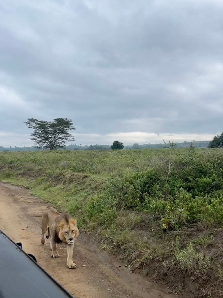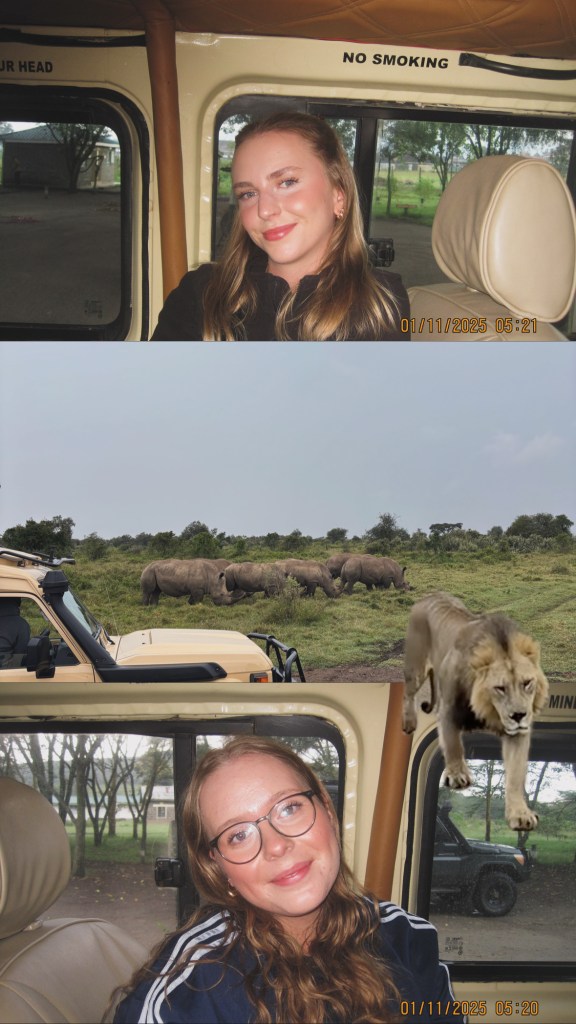 Da es meine erste Safari überhaupt war, hatte ich keine großen Erwartungen. Aber schon nach fünf Minuten stand das erste Highlight vor uns: ein Löwe! Mr. Davie bekam über Funk einen Tipp, bog in einen anderen Weg ein – und plötzlich kam der Löwe direkt auf uns zu. So nah hätten wir nie gedacht, einem Löwen zu begegnen! Damit war das erste Tier der „Big Five“ schon mal abgehakt. Kurz darauf sahen wir Büffel und eine große Gruppe Nashörner. Außerdem begegneten uns Affen, Zebras und unzählige bunte Vögel. Es war einfach beeindruckend – so viele Tiere, so nah, so lebendig.